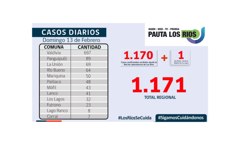1.170 contagios nuevos en los Ríos, 1 caso recibido desde la Región de los Lagos.