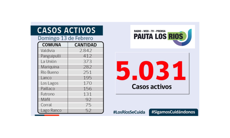 A la fecha, hay 5.031 casos activos, de los cuales 2.842 corresponden a la comuna de Valdivia y 412 a la comuna de Panguipulli.