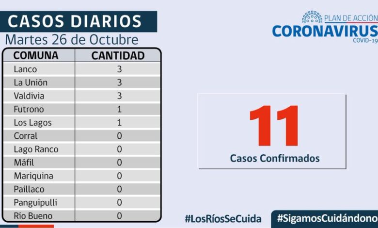 11 nuevos casos confirmados hoy en los Ríos , 123 contagios activos en la Región.