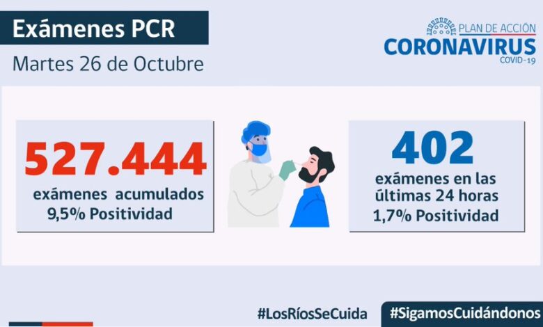 La Red de Laboratorios de Los Ríos procesó en las últimas 24 horas, 402 muestras, arrojando un índice diario de positividad de 1,7%. La cantidad total de exámenes PCR realizados en la región asciende a 527.444 con una positividad acumulada de 9,5%.