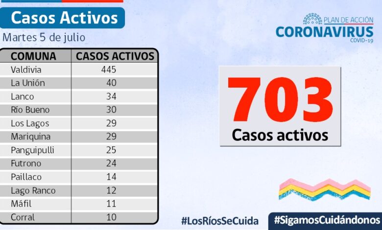 A la fecha, hay 703 casos activos, de los cuales 445 corresponden a la comuna de Valdivia y 40 a la comuna de La union.