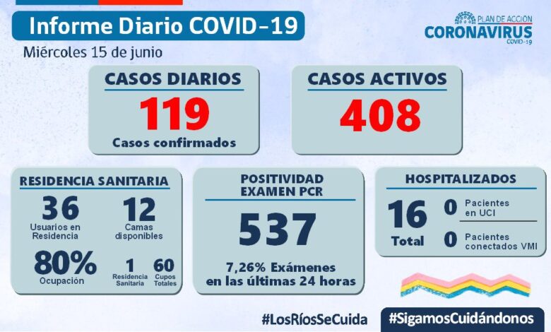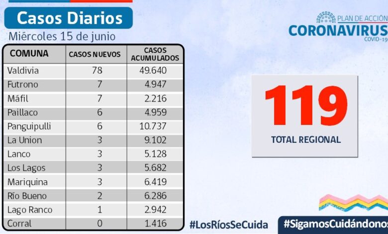 La Secretaría Regional Ministerial de Salud Los Ríos informó que 119 exámenes resultaron positivos para SARS-CoV-2. Del total de casos, 39 se diagnosticaron mediante test PCR y 79 fueron pesquisados con test de antígeno.