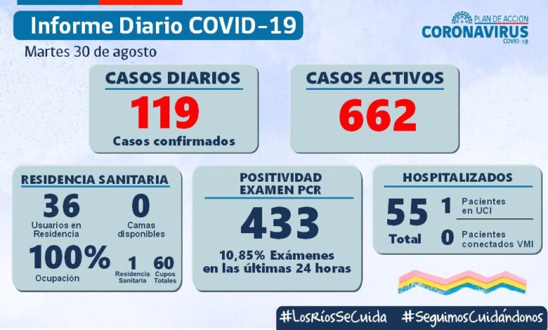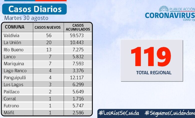 La Secretaría Regional Ministerial de Salud Los Ríos informó que 119 exámenes resultaron positivos para SARS-CoV-2. De dicho total, 47 se diagnosticaron mediante test PCR y 72 fueron pesquisados con test de antígeno.