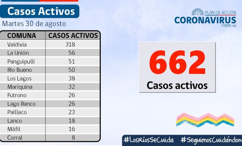 A la fecha, hay 662 casos activos, de los cuales 318 corresponden a la comuna de Valdivia y 56 a la comuna de La Unión.