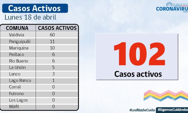 A la fecha, hay 102 casos activos, de los cuales 60 corresponden a la comuna de Valdivia y 11 a la comuna de Panguipulli.