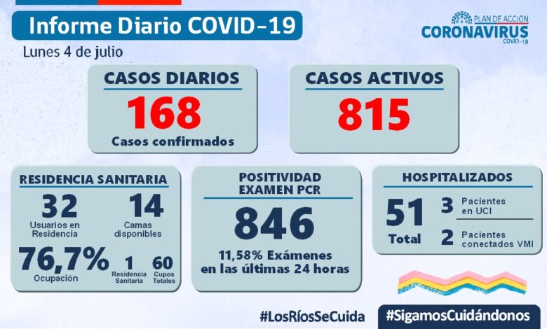 168 nuevos contagios se informan hoy, la autoridad sanitaria informa además de 815 casos activos en los Ríos