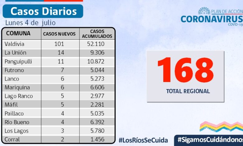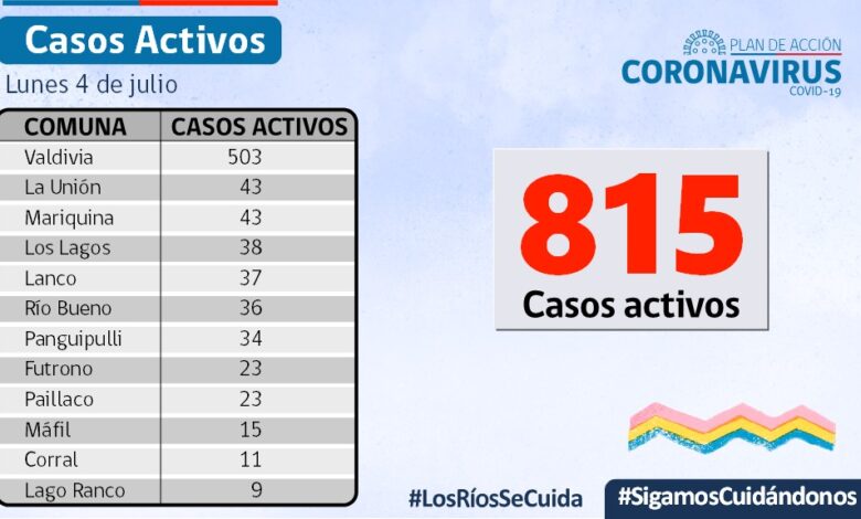 A la fecha, hay 815 casos activos, de los cuales 503 corresponden a la comuna de Valdivia y 43 a la comuna de La union.La Secretaría Regional Ministerial de Salud Los Ríos informó que 168 exámenes resultaron positivos para SARS-CoV-2. Del total de casos, 99 se diagnosticaron mediante test PCR y 69 fueron pesquisados con test de antígeno.