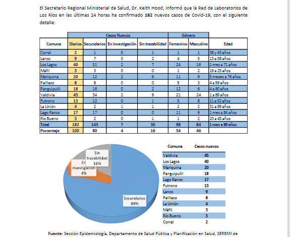 La Secretaría Regional Ministerial de Salud notificó 182 exámenes positivos para SARS-CoV-2 recibidos desde la Red de Laboratorios de Los Ríos con residencia en Los Ríos.