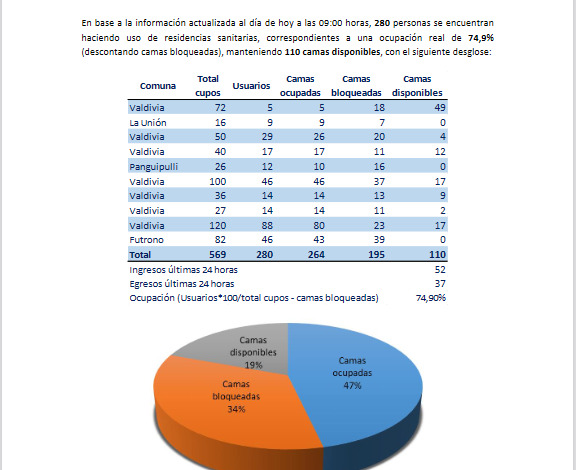 Respecto a las Residencias Sanitarias, a la fecha, 280 personas están haciendo uso de estos espacios de aislamiento, lo que representa una ocupación real del 74,9%. En ese sentido, de las 569 camas en total, 264 están ocupadas y 110 camas están disponibles.