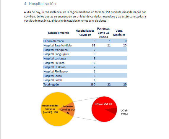 En cuanto a las hospitalizaciones, 130 pacientes se mantienen internados en distintos recintos asistenciales de la región, de los cuales 22 se encuentran en la Unidad de Cuidados Intensivos (UCI) y 20 de ellos, están conectados a ventilación mecánica.