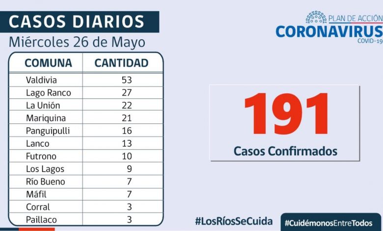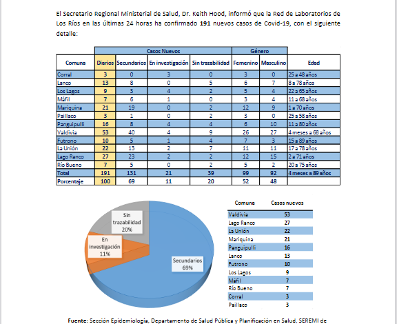 191 casos nuevos informados hoy, Valdivia , Lago Ranco y La Unión hoy nuevamente con dos digitos en los casos diarios.