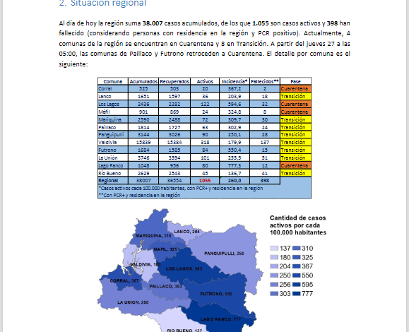 De los 191 casos confirmados por residencia en Los Ríos, 131 corresponden a casos secundarios, 39 aún están sin trazabilidad y 21 se encuentran en investigación. En tanto, a la fecha, la región presenta 38.007 casos acumulados, de los cuales 1.055 corresponden a casos activos, 36.554 a personas recuperadas y 398 a fallecidos.
