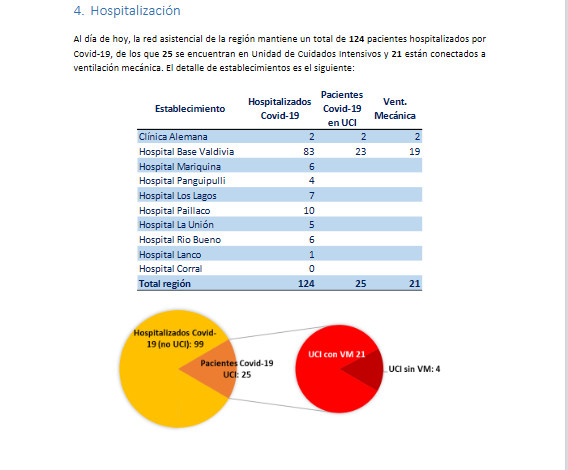 En cuanto a las hospitalizaciones, 124 pacientes se mantienen internados en distintos recintos asistenciales de la región, de los cuales 25 se encuentran en la Unidad de Cuidados Intensivos (UCI) y 21 de ellos, están conectados a ventilación mecánica.