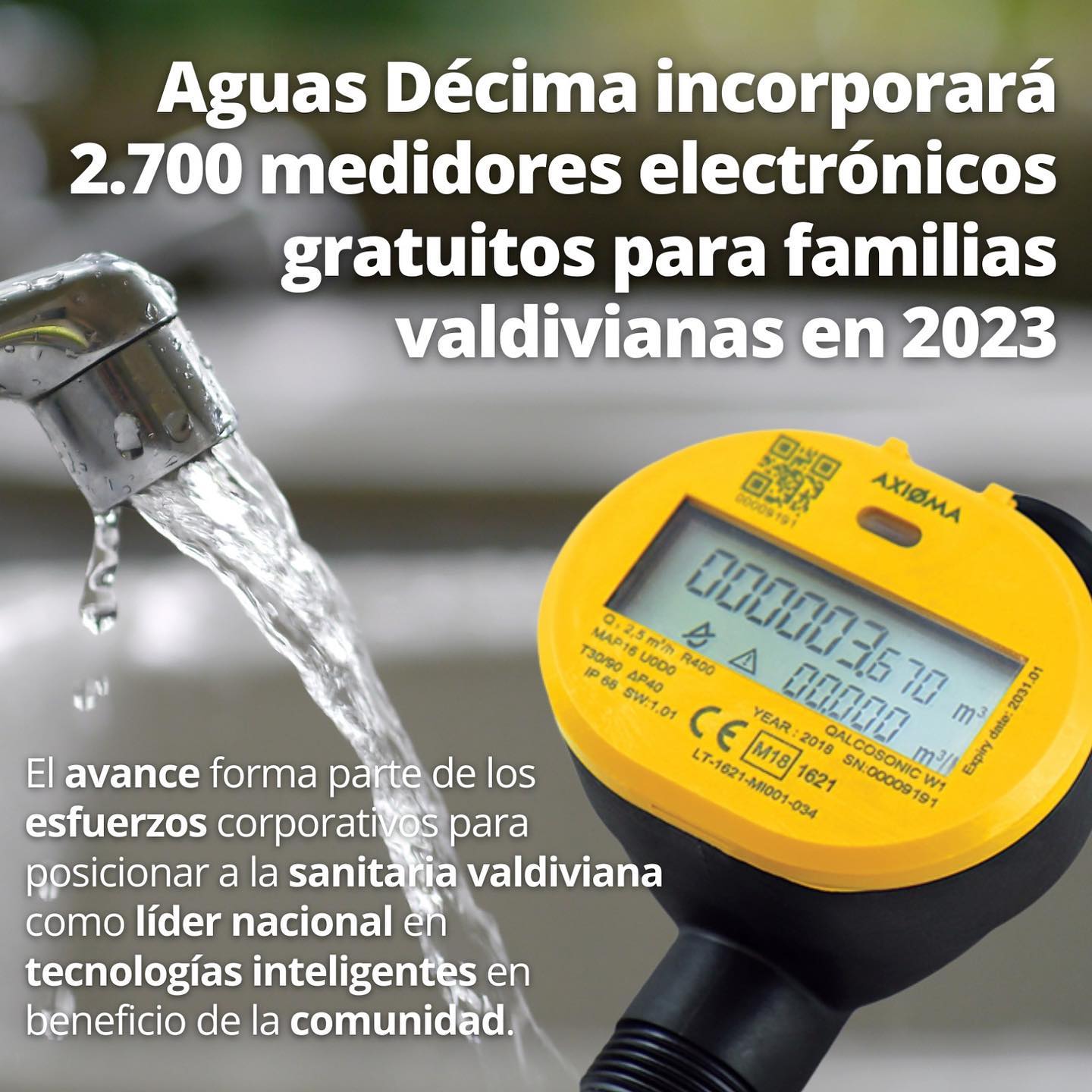 2.700 medidores electrónicos con tecnología de punta proyecta instalar este año aguas decima en hogares y establecimientos de Valdivia .La inversión para 2023 superará los 160 millones de pesos y su valor no se traspasará a los clientes, aseguraron desde la compañía.