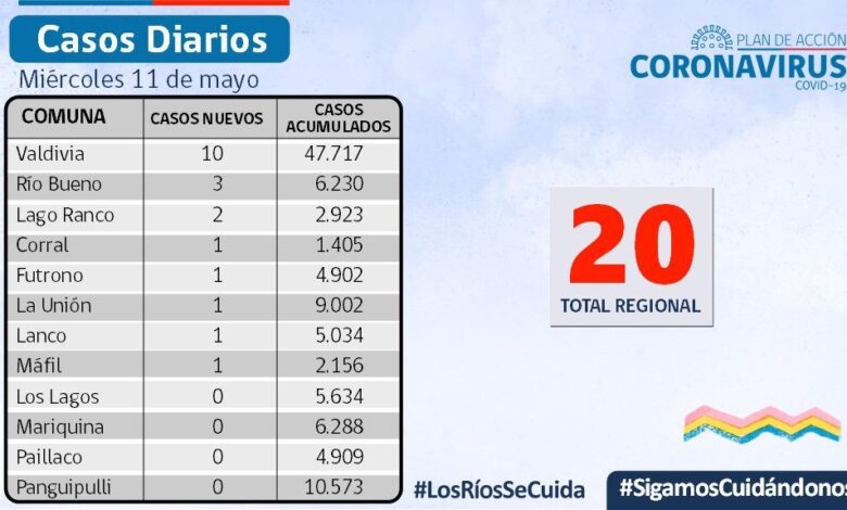 20 casos nuevos de Covid-19 , en tanto 1 comuna no registra casos activos (Lago Ranco)