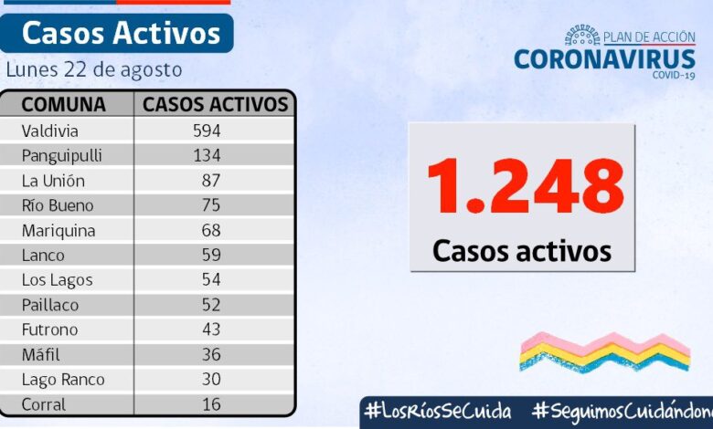 A la fecha, hay 1.248 casos activos, de los cuales 594 corresponden a la comuna de Valdivia y 134 a la comuna de Panguipulli.