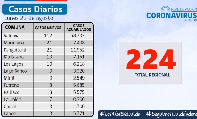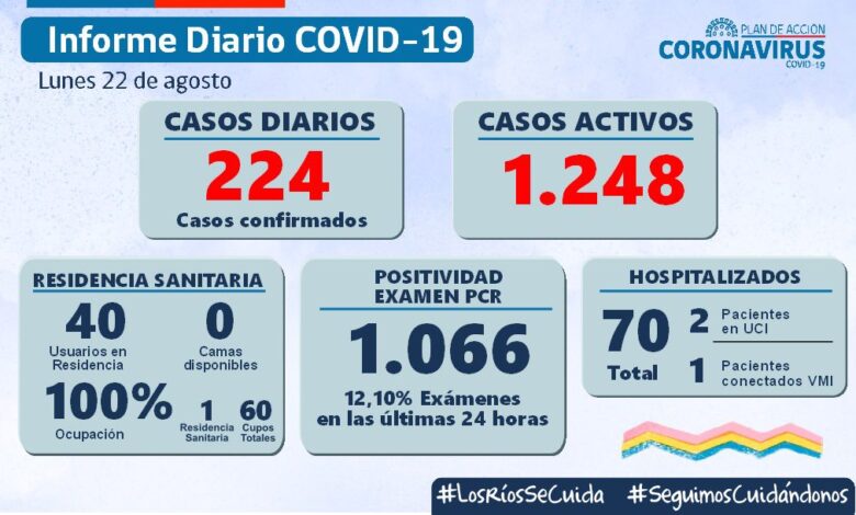 La Secretaría Regional Ministerial de Salud Los Ríos informó que 224 exámenes resultaron positivos para SARS-CoV-2. Del total de casos nuevos, 158 se diagnosticaron mediante test PCR y 66 fueron pesquisados con test de antígeno.