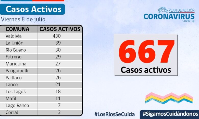 A la fecha, hay 667 casos activos, de los cuales 430 corresponden a la comuna de Valdivia y 39 a la comuna de La Unión.