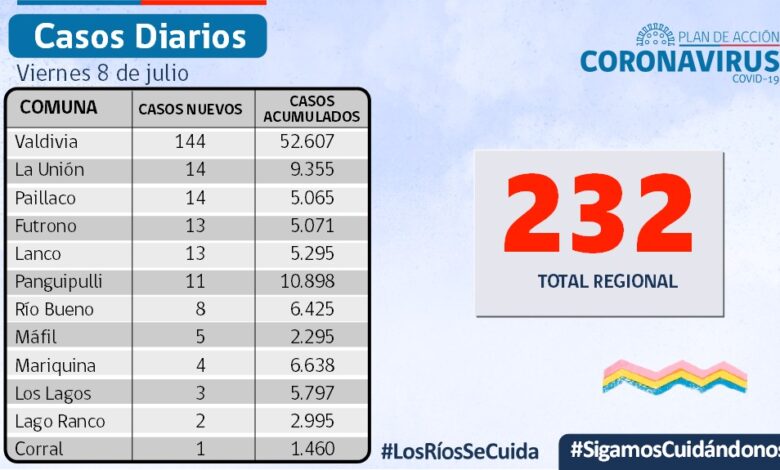 La Secretaría Regional Ministerial de Salud Los Ríos informó que 232 exámenes resultaron positivos para SARS-CoV-2. Del total de casos, 131 se diagnosticaron mediante test PCR y 101 fueron pesquisados con test de antígeno.