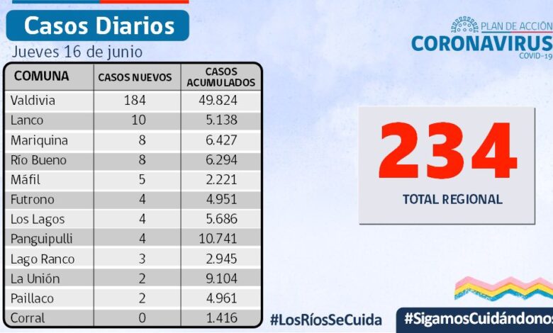 La Secretaría Regional Ministerial de Salud Los Ríos informó que 234 exámenes resultaron positivos para SARS-CoV-2. Del total de casos, 165 se diagnosticaron mediante test PCR y 69 fueron pesquisados con test de antígeno.