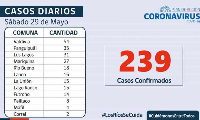 239 casos nuevos por Covid-19 en los Rios, Valdivia encabeza la jornada con 54, Panguipulli 35 seguido de Los Lagos y Mariquina.