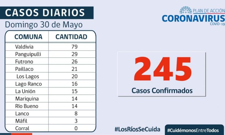 El Secretario Regional de Salud de los Ríos informó hoy domingo que la red de laboratorios de la Región confirmó 245 nuevos casos por Covid-19.