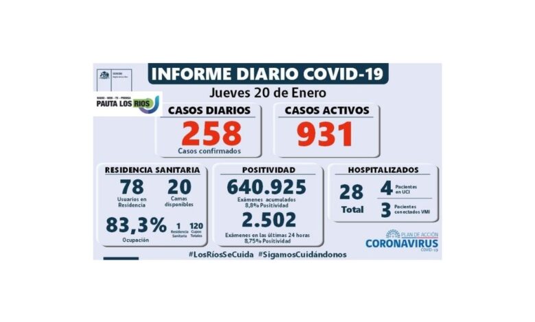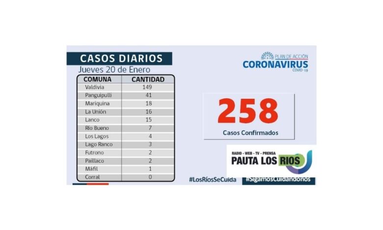 La Secretaría Regional Ministerial de Salud notificó 255 exámenes positivos para SARS-CoV-2 recibidos desde la Red de Laboratorios de Los Ríos. Adicionalmente se recibieron tres casos positivos desde la Región Metropolitana, por lo que, en esta jornada se suman 258 casos Covid-19 en Los Ríos.