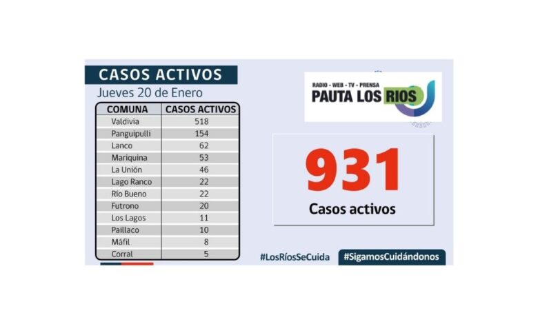 De los 258 casos confirmados por residencia en Los Ríos, 147 corresponden a casos secundarios, 44 están en investigación, 65 aún están sin trazabilidad y 2 casos son importados. En tanto, a la fecha, la región presenta 56.482 casos acumulados, de los cuales 931 corresponden a casos activos, 54.846 a personas recuperadas y 705 a fallecidos.