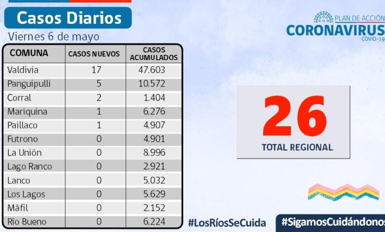 26 nuevos casos se reportan hoy en los Ríos, solo Lago Ranco no registra casos activos