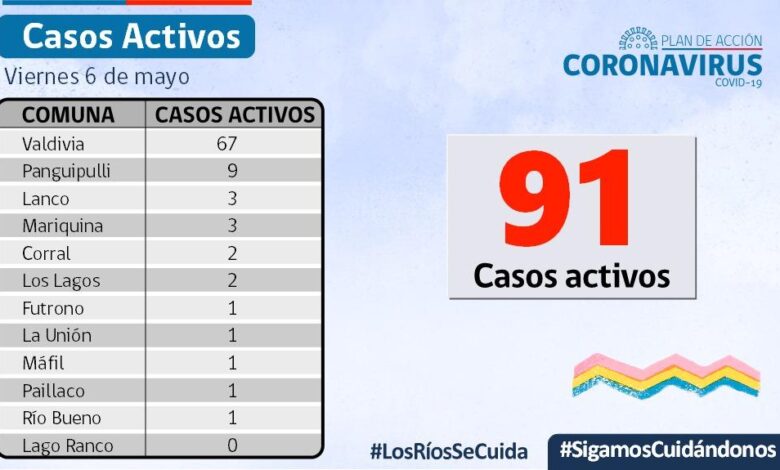 A la fecha, hay 91 casos activos, de los cuales 67 corresponden a la comuna de Valdivia y 9 a la comuna de Panguipulli . La Secretaría Regional Ministerial de Salud informó que 26 exámenes resultaron positivos para SARS-CoV-2. Del total de casos, 13 se diagnosticaron mediante test PCR y 13 fueron pesquisados con test de antígeno.