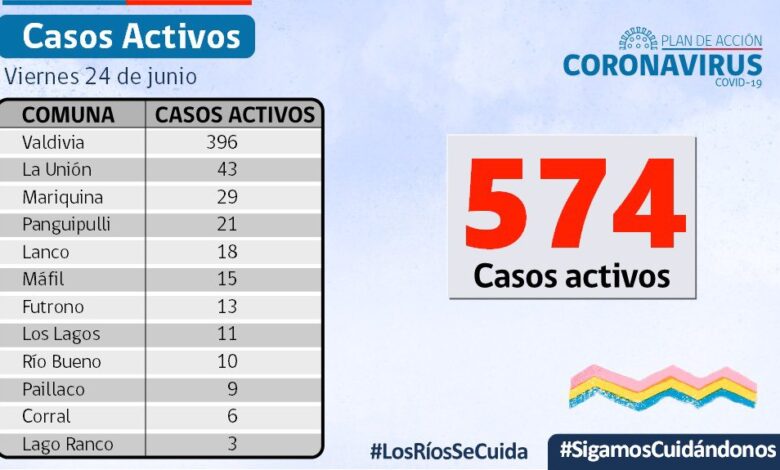A la fecha, hay 574 casos activos, de los cuales 396 corresponden a la comuna de Valdivia y 43 a la comuna de La Unión.