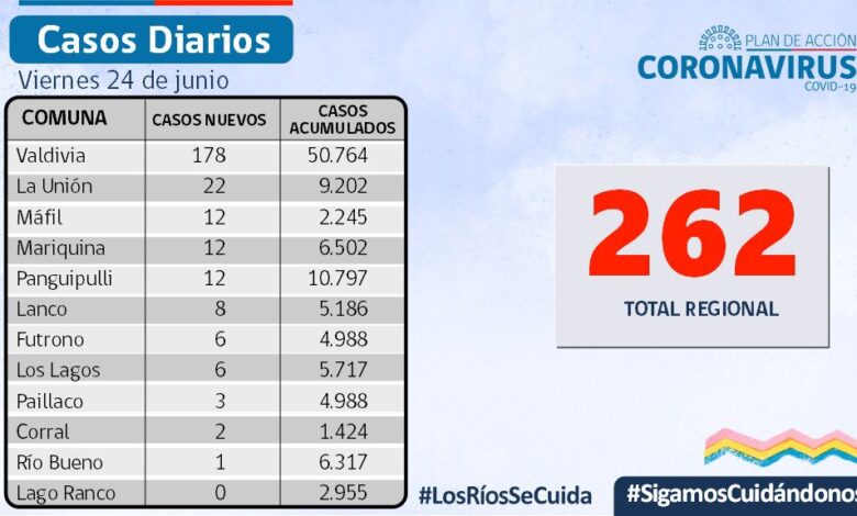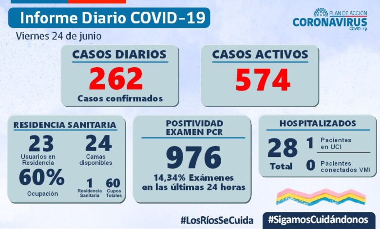 La Secretaría Regional Ministerial de Salud Los Ríos informó que 262 exámenes resultaron positivos para SARS-CoV-2. Del total de casos, 142 se diagnosticaron mediante test PCR y 120 fueron pesquisados con test de antígeno.