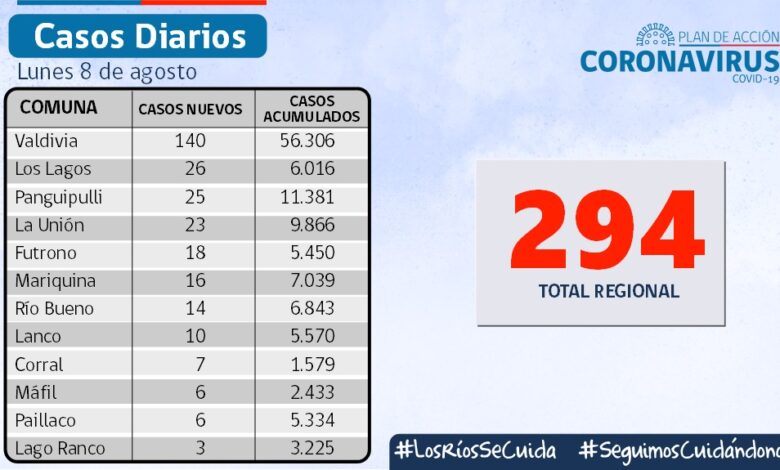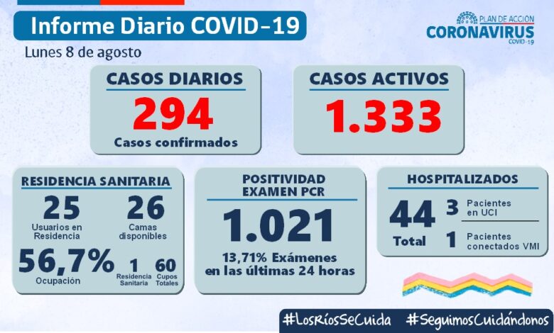 La Secretaría Regional Ministerial de Salud Los Ríos informó que 294 exámenes resultaron positivos para SARS-CoV-2. Del total, 139 se diagnosticaron mediante test PCR y 155 fueron pesquisados con test de antígeno.
