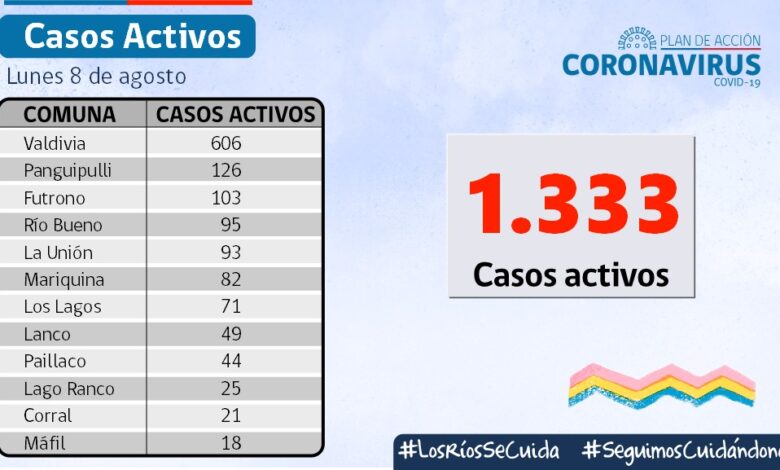 A la fecha, hay 1.333 casos activos, de los cuales 606 corresponden a la comuna de Valdivia y 126 a la comuna de Panguipulli.