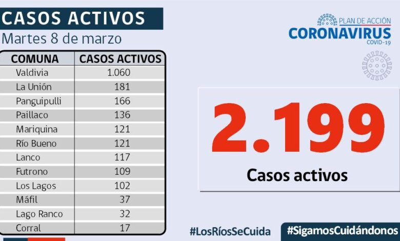 A la fecha, hay 2.199 casos activos, de los cuales 1.060 corresponden a la comuna de Valdivia y 181 a la comuna de La Unión.