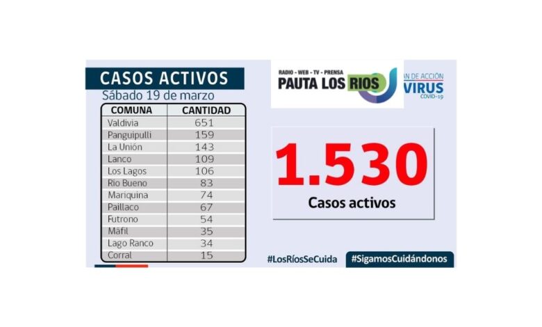 A la fecha, hay 1.530 casos activos, de los cuales 652 corresponden a la comuna de Valdivia y 159 a la comuna de Panguipulli.