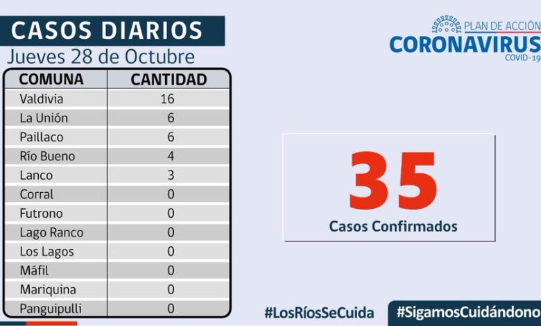 De los 35 casos confirmados por residencia en Los Ríos, 31 corresponden a casos secundarios, 2 están en investigación y 2 se encuentran sin trazabilidad. En tanto, a la fecha, la región presenta 50.215 casos acumulados, de los cuales 125 corresponden a casos activos, 49.430 a personas recuperadas y 660 a fallecidos.