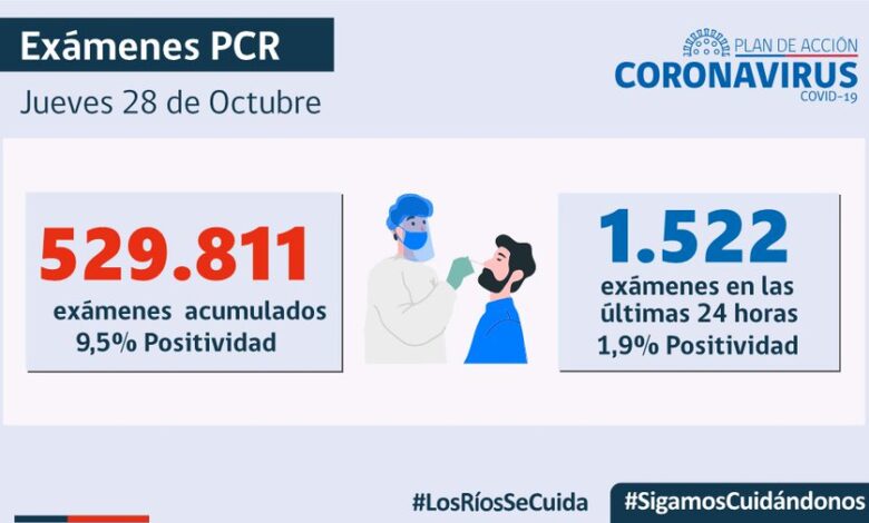 La Red de Laboratorios de Los Ríos procesó en las últimas 24 horas, 1.522 muestras, arrojando un índice diario de positividad de 1,9%. La cantidad total de exámenes PCR realizados en la región asciende a 529.811 con una positividad acumulada de 9,5%.