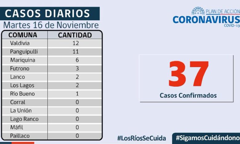 El SEREMI de Salud, Keith Hood, informó que hoy se reportaron 37 nuevos casos de COVID-19 en Los Ríos,a la fecha en Los Ríos hay 523 casos activos, de los cuales 336 corresponden a la comuna de Valdivia y 45 a la comuna de Lanco, durante esta jornada se informó el procesamiento de 721 exámenes, con una positividad de 4,6% , hoy, en la Red Integrada de Los Ríos se mantienen 15 personas hospitalizadas, 4 de ellas, conectadas a un ventilador mecánico.En Residencias Sanitarias se mantienen 72 usuarios, lo que representa un 76,7% de ocupación de camas .