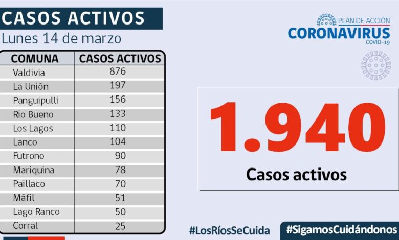 A la fecha, hay 1.940 casos activos, de los cuales 876 corresponden a la comuna de Valdivia y 197 a la comuna de La Unión.