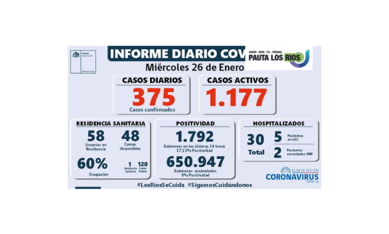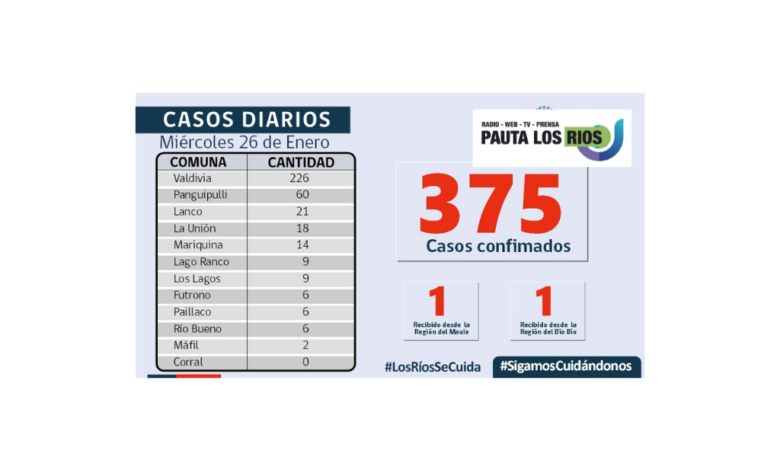 La Secretaría Regional Ministerial de Salud notificó 375 exámenes positivos para SARS-CoV-2 recibidos desde la Red de Laboratorios de Los Ríos. Adicionalmente se recibieron un caso de la región del Maule y un caso de la región del Biobío, por lo tanto al día de hoy se informan 377 nuevos casos para la región.