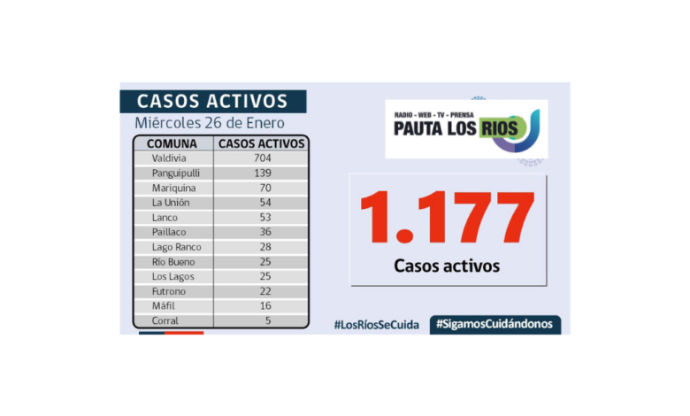 A la fecha, hay 1.177 casos activos, de los cuales 704 corresponden a la comuna de Valdivia y 139 a la comuna de Panguipulli.