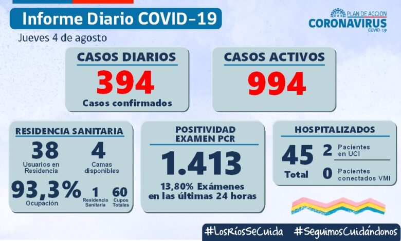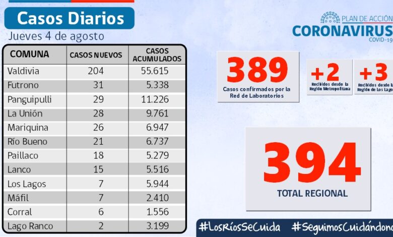 La Secretaría Regional Ministerial de Salud Los Ríos informó que 389 exámenes resultaron positivos para SARS-CoV-2. Adicionalmente se reciben dos casos desde la Región Metropolitana y tres casos desde la región de Los Lagos. Es así que el total de casos nuevos en Los Ríos es de 394. De dicho total, 207 se diagnosticaron mediante test PCR y 187 fueron pesquisados con test de antígeno.