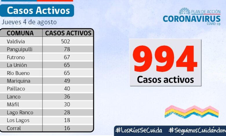 A la fecha, hay 994 casos activos, de los cuales 502 corresponden a la comuna de Valdivia y 78 a la comuna de Panguipulli.