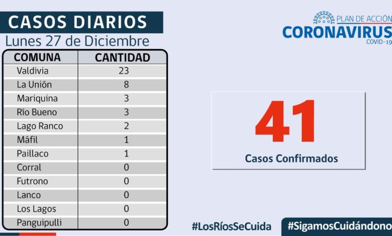 El SEREMI de Salud(S), Leonardo Bórquez, informó que hoy se reportaron 41 nuevos casos de COVID-19 en Los Ríos,a la fecha en Los Ríos hay 382 casos activos, de los cuales 245 corresponden a la comuna de Valdivia y 20 a la comuna de Paillaco, hoy, en la Red Integrada de Los Ríos se mantienen 35 personas hospitalizadas, 8 de ellas, conectadas a un ventilador mecánico. Durante esta jornada se informó el procesamiento de 259 exámenes, con una positividad de 8,5%, en Residencias Sanitarias se mantienen 51 usuarios, lo que representa un 60,8% de ocupación de camas, en esta jornada, se informó el lamentable deceso de 1 persona, de la comuna de Río Bueno.