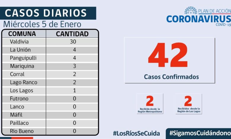 La Secretaría Regional Ministerial de Salud notificó 42 exámenes positivos para SARS-CoV-2 recibidos desde la Red de Laboratorios de Los Ríos. Adicionalmente se recibieron 2 casos derivados desde la región Metroplitana y 2 casos derivados desde la región de Los Lagos. Por tanto, al día de hoy, se informan 46 nuevos casos de coronavirus en Los Ríos.