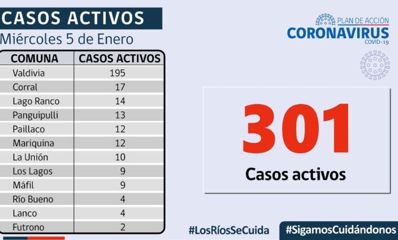A la fecha, hay 301 casos activos, de los cuales 195 corresponden a la comuna de Valdivia y 17 a la comuna de Corral.