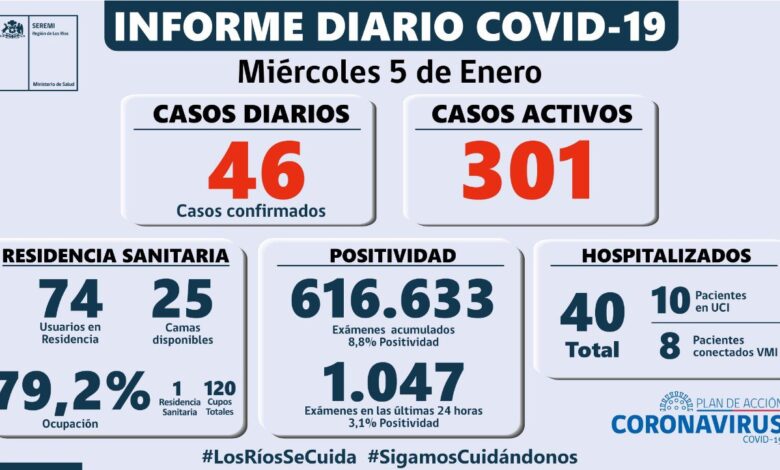 De los 46 casos confirmados por residencia en Los Ríos, 26 corresponden a casos secundarios, 12 aún están sin trazabilidad, 6 están en investigación y 2 casos son importados. En tanto, a la fecha, la región presenta 54.521 casos acumulados, de los cuales 301 corresponden a casos activos, 53.531 a personas recuperadas y 689 a fallecidos.