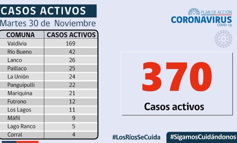 El SEREMI de SalA la fecha en Los Ríos hay 370 casos activos, de los cuales 169 corresponden a la comuna de Valdivia y 42 a la comuna de Río Bueno , Keith Hood, informó que hoy se reportaron 42 nuevos casos de COVID-19 en Los Ríos, hoy en la Red Integrada de Los Ríos se mantienen 26 personas hospitalizadas, 4 de ellas, conectadas a un ventilador mecánico.Durante esta jornada se informó el procesamiento de 862 exámenes, con una positividad de 3,7% ,en Residencias Sanitarias se mantienen 69 usuarios, lo que representa un 68,3% de ocupación de camas,en esta jornada, se informó el lamentable deceso de 1 persona, de la comuna de La Unión .