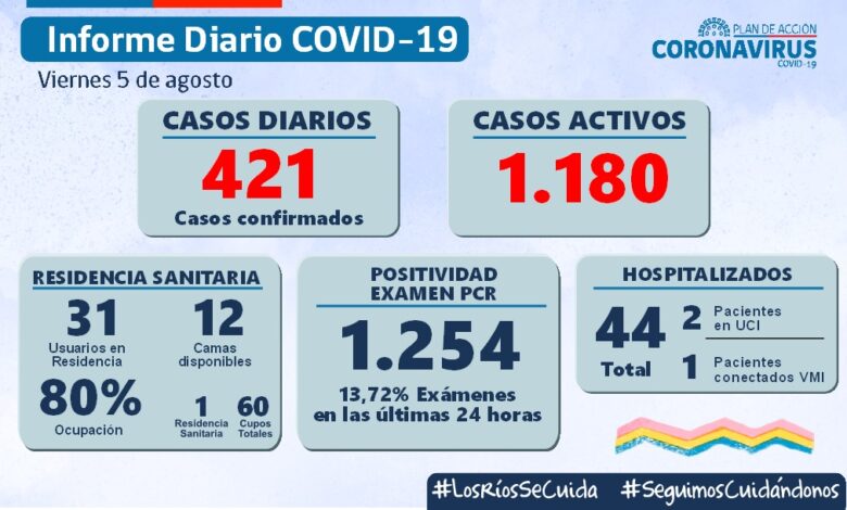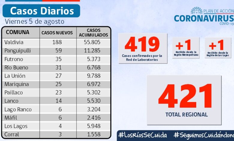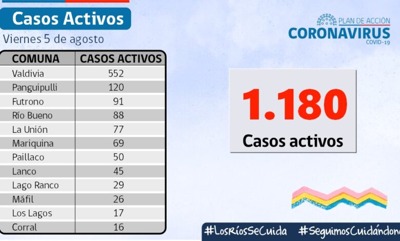 A la fecha, hay 1.180 casos activos, de los cuales 552 corresponden a la comuna de ValdiviaLa Secretaría Regional Ministerial de Salud Los Ríos informó que 419 exámenes resultaron positivos para SARS-CoV-2. Adicionalmente se recibe un caso de la Región Metropolitana y un caso de la región de Los Lagos. Es así que el total de casos nuevos en Los Ríos es de 421. De dicho total, 169 se diagnosticaron mediante test PCR y 252 fueron pesquisados con test de antígeno.